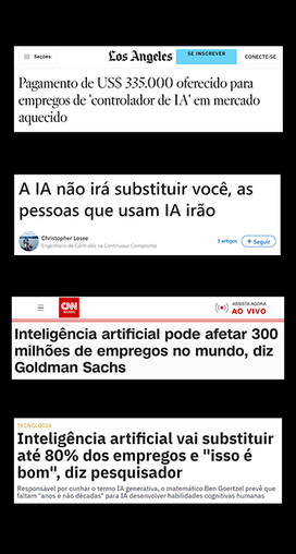 As notícias ao lado, que saíram em alguns dos principais portais de notícias brasileiros e internacionais, mostram o quanto a Inteligência Artificial, comandada principalmente pelo ChatGPT, está mudando o mercado de trabalho muito rápido.